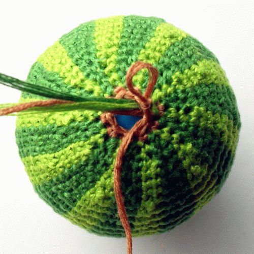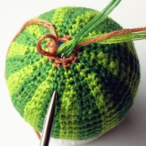 Связав хвостик, необходимо обрезать нашу ниточку, оставив кончик примерно 20 см. Затем, оставшимся кончиком ниточки пришьём хвостик арбузика к телу и, при необходимости, можно зашить дырочки у основания хвостика.