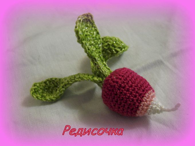 -нитки «ирис»:ярко-розовый,светло-розовый,белый для тела редиски,светло-зеленый и потемнее зеленый для листьев(можно вязать и в одну нитку,но тогда листочки могут плохо держать форму).