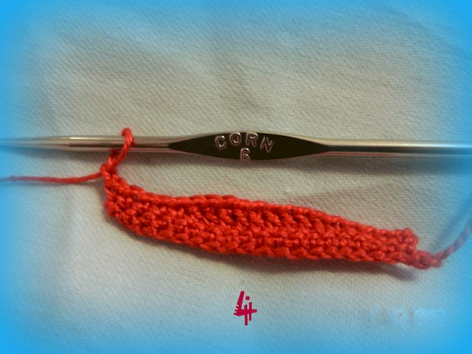 1 ряд- пять столбиков без накида,девять столбиков с накидом, пять столбиков без накида. Вязание переворачиваем.Делаем одну воздушную петлю подъема,2 ряд начинаем вязать во вторую от крючка петлю.Так делаем в каждом ряду.