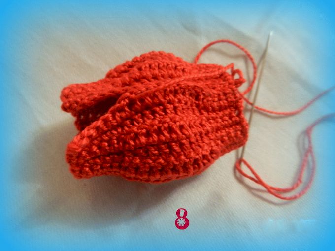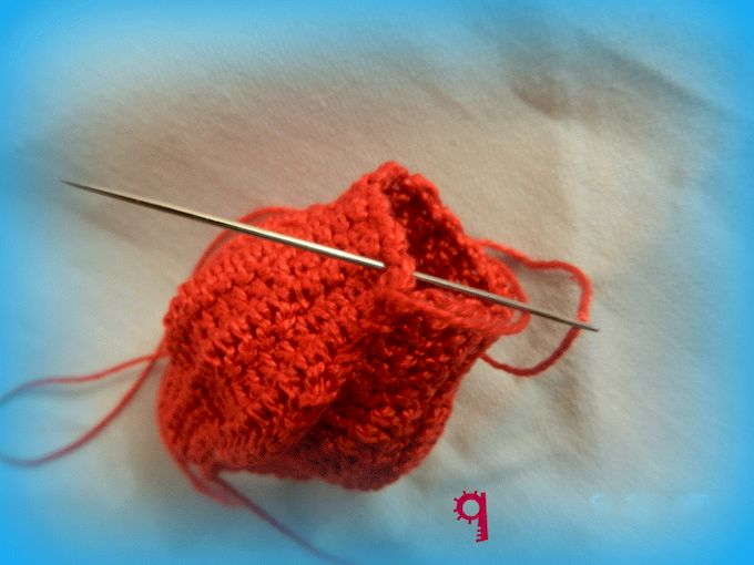 Провязав нужное количество рядов(можно сделать их больше или меньше,смотря,какой толщины будет ваш Сеньор Помидор.),сшиваем вдоль края полотна, той же нитью что вязали и иголкой с толстым ушком