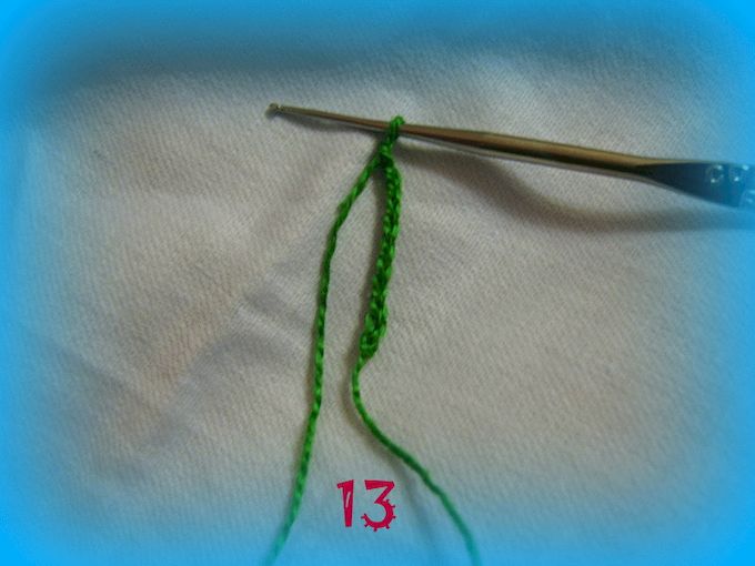 ЛИСТОЧКИ.Для вязания листочков набираем зеленой нитью 10 воздушных петель.