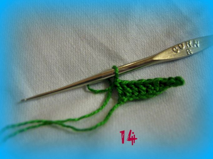 Дальше вяжем вдоль цепочки 2 соединительных столбика, 2 полустолбика с накидом, 5 столбиков с накидом. Один листик мы связали.