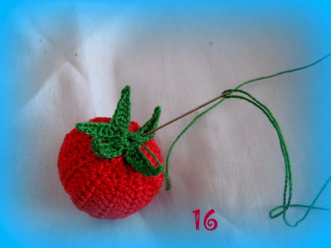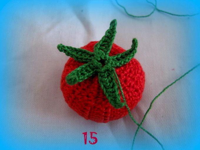 Оставшийся конец нити вдеть в иголку и пришить к помидору по центру, оставляя самые краешки листиков не пришитыми.
