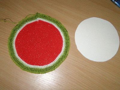 Сложить картонный круг по диаметру, сверху накрыть кружочком арбуза и начать зашивать с угла, впихивая немного полотна вовнутрь, что бы арбуз принял форму настоящего