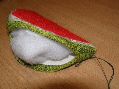 Сначала зашить оба угла, потом вложить поролон или синтепон между картонными половинками, что бы получившийся арбуз держал форму, и зашить оставшееся отверстие. Получится вот такая долька.