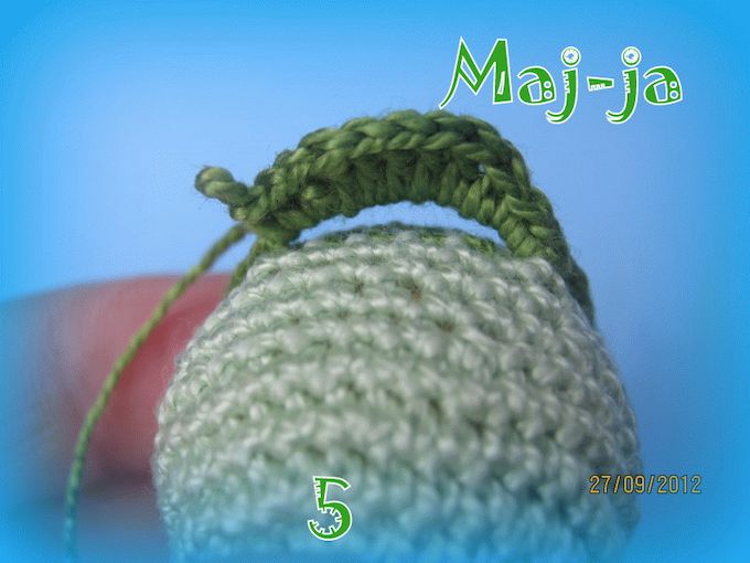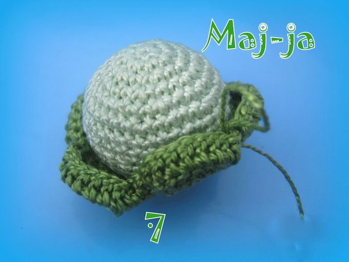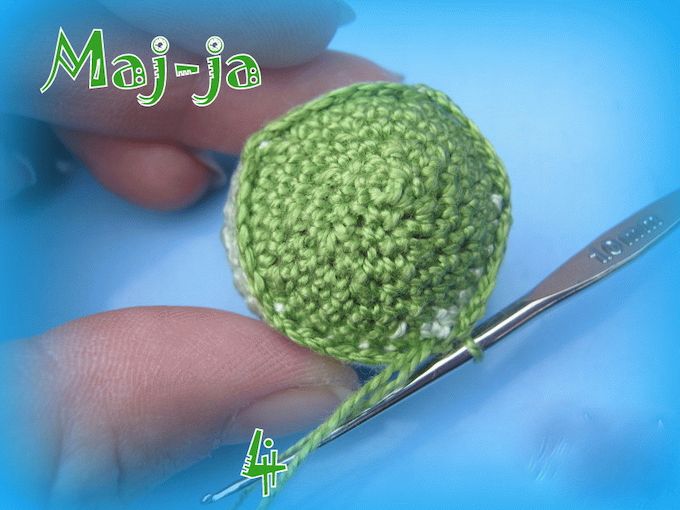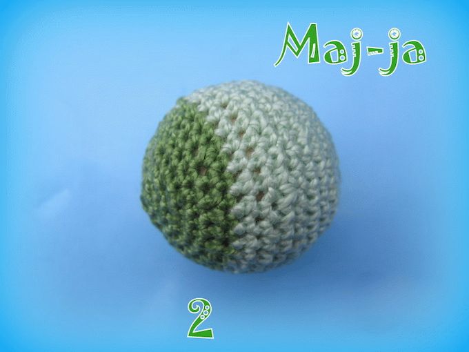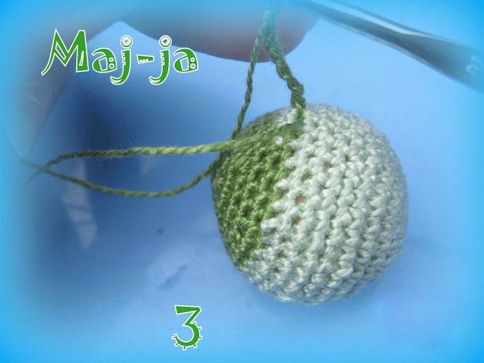 Сначала я обвязала ее ,как обвязывают бусину(выложу для тех,кто еще не умеет этого делать,позже),двумя цветами:более светлую часть -это будет верх капустки-сделала больше,более темную(низ)-меньше.После обвязки бусинки,нить я обрезала.Вы можете связать капустку одного цвета,если хотите.