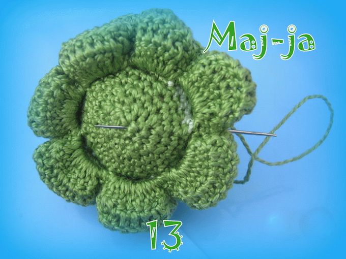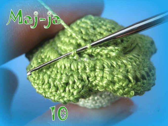 Теперь я обвязываю их,как и внутренние листочки:2 столбика без накида-8 столбиков с накидом-2 столбика без накида.И так вяжу 3 ряда.