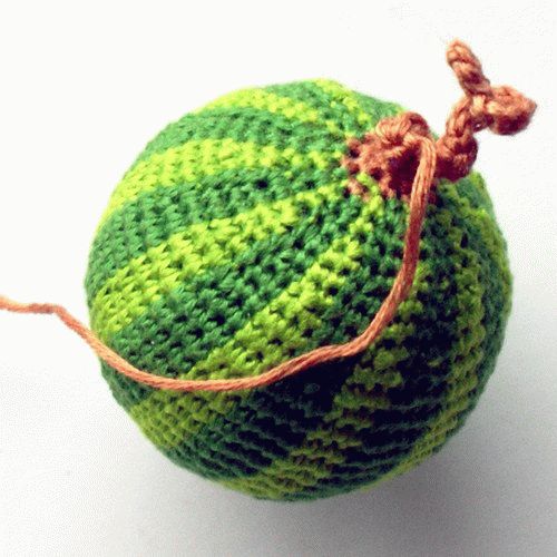 Связав хвостик, необходимо обрезать нашу ниточку, оставив кончик примерно 20 см. Затем, оставшимся кончиком ниточки пришьём хвостик арбузика к телу и, при необходимости, можно зашить дырочки у основания хвостика.